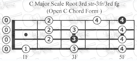 第一巻(Vol.1)ではローフレット5フレットまで範囲のポジションで、5弦3フレットをルート音に持つフィンガリング・パターンを使っています。